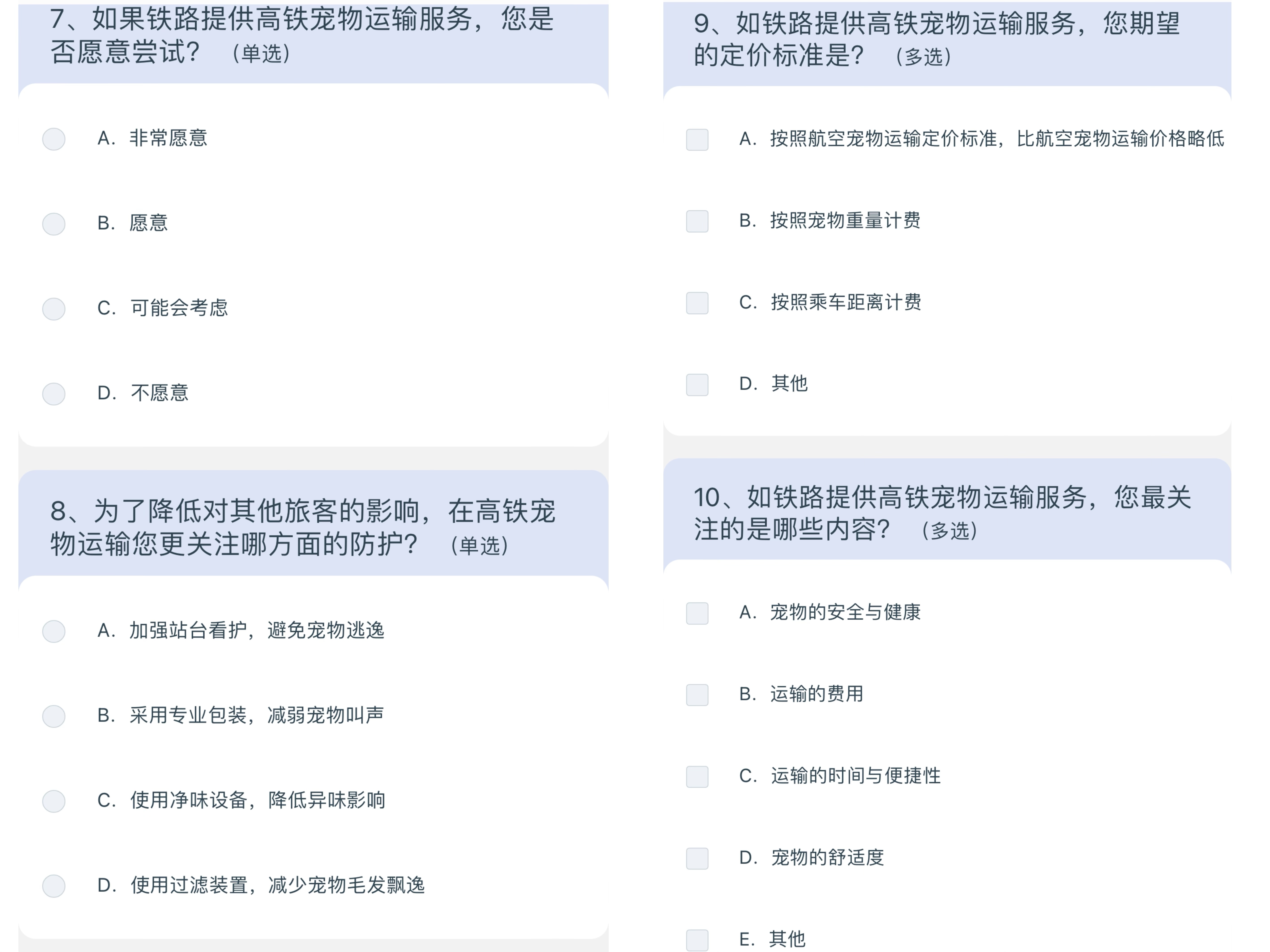 还有一些关于高铁宠物运输服务的假设性问题,“如铁路提供高铁宠物运输服务,您期望的定价标准是?”“如果铁路提供高铁宠物运输服务,您是否愿意尝试?”“如铁路提供高铁宠物运输服务,您最关注的是哪些内容?”