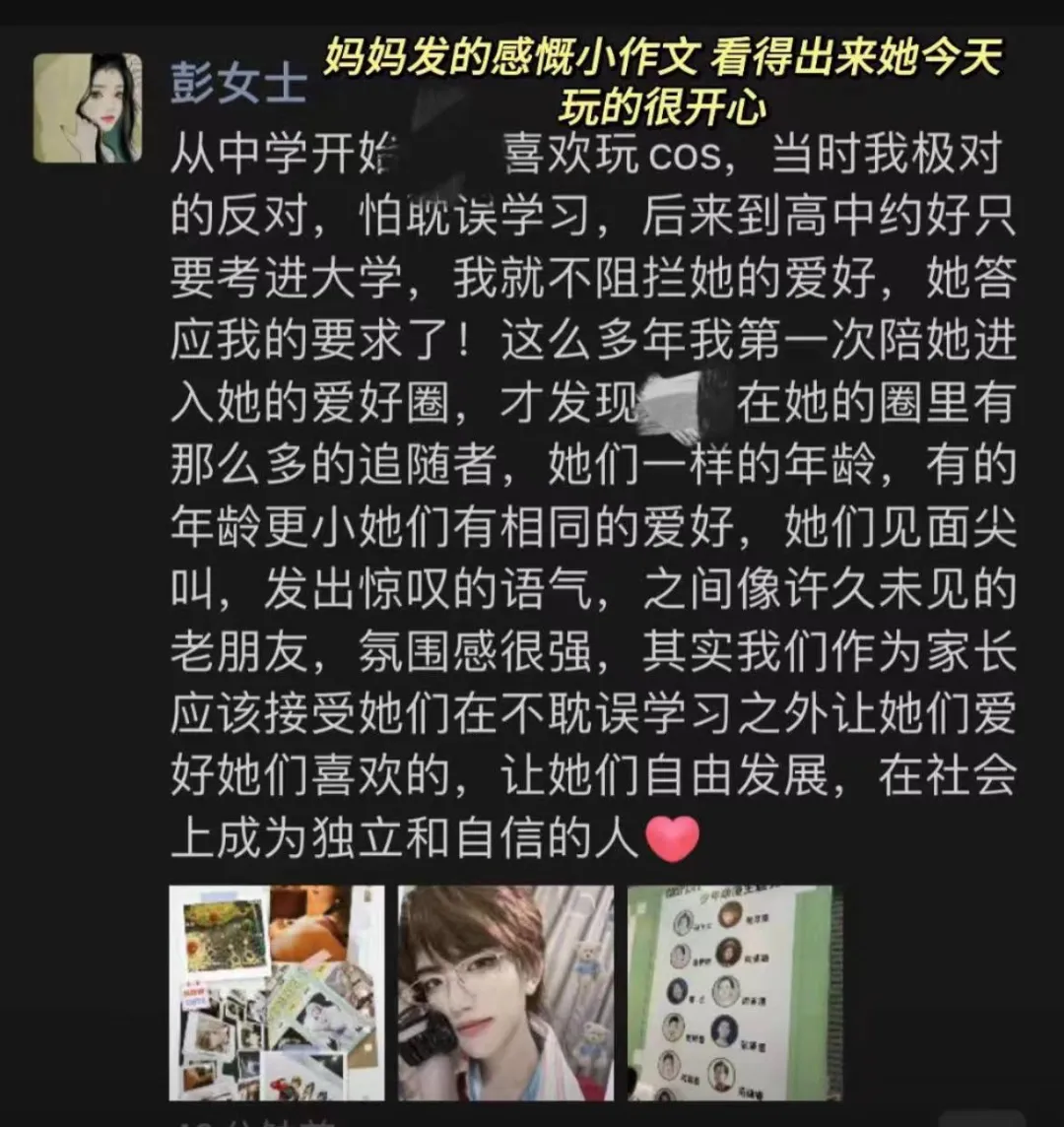 没想到,妈妈答应得很爽快。以前中学时,妈妈还不太理解我的这些爱好,但也不曾过多约束。这次Cosplay的服装、饰品,是我和奶奶联手赶制出来的。妈妈在漫展上玩得很开心,回来还在朋友圈发了“小作文”。