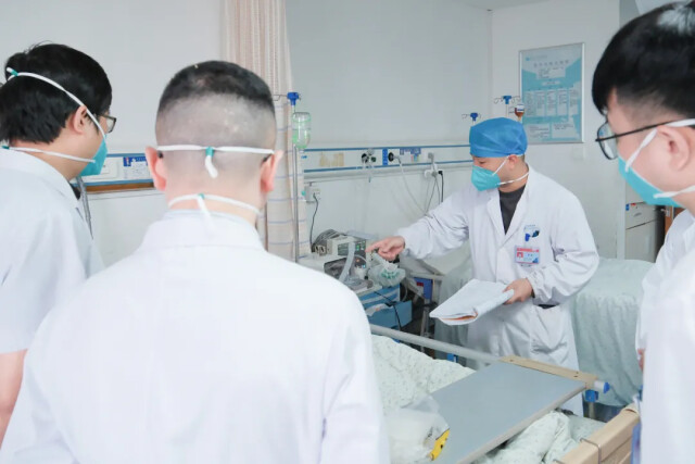 床旁早交班结束,8时15分,重症医学科主任蒋泽华带领科室医生来ICU查房,当天值夜班的护士李波介绍患者前一天治疗进展,以便医生做出更准确的判断。
