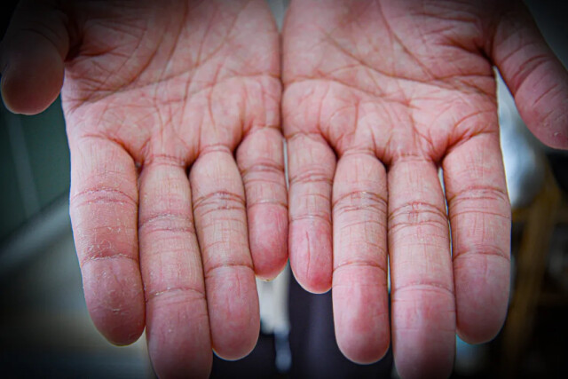 由于需要时刻保持手部清洁,消毒水浸泡下的双手出现干皮、皲裂,几乎没有消停过,很难想象这是一双00后的手。