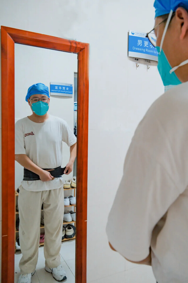 7时20分,ICU护士霍旭琪因近日腰部劳损,带上护腰,换上护士服,准备迎战一天的工作。