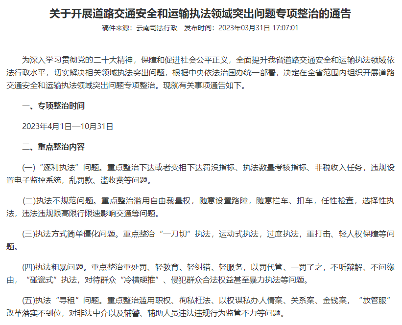 记者注意到,云南省在2023年4月至10月,开展道路交通安全和运输执法领域突出问题专项整治工作,主要集中整治“逐利执法”、执法不规范、执法方式简单僵化、执法粗暴、执法“寻租”等群众反映强烈的突出问题。其中,“碰瓷式”执法被纳入执法粗暴问题范畴,要进行重点整治。