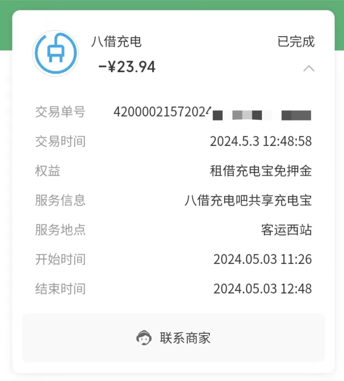 今年“五一”假期期间,杨先生前往安徽凤阳旅游。5月3日中午返程时,由于手机电量较低,杨先生在凤阳客运西站等车期间,通过一个名为“八借充电”的充电宝自助机,租借了一个充电宝,“当时租的时候没有仔细看计费规则,以为收费和其他的充电宝都差不多。”