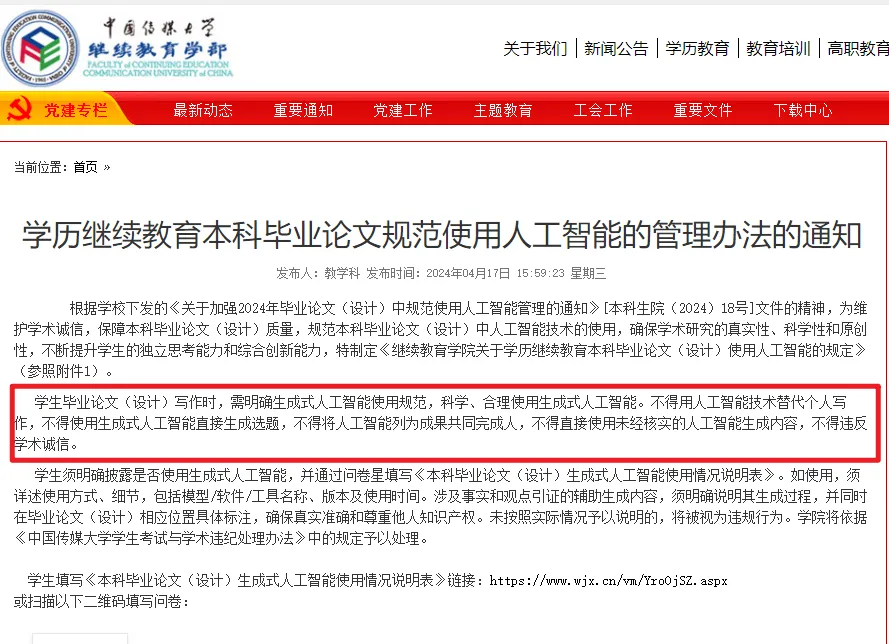 一些高校也明确了生成式人工智能使用规范,例如中国传媒大学继续教育学部在通知中指出: