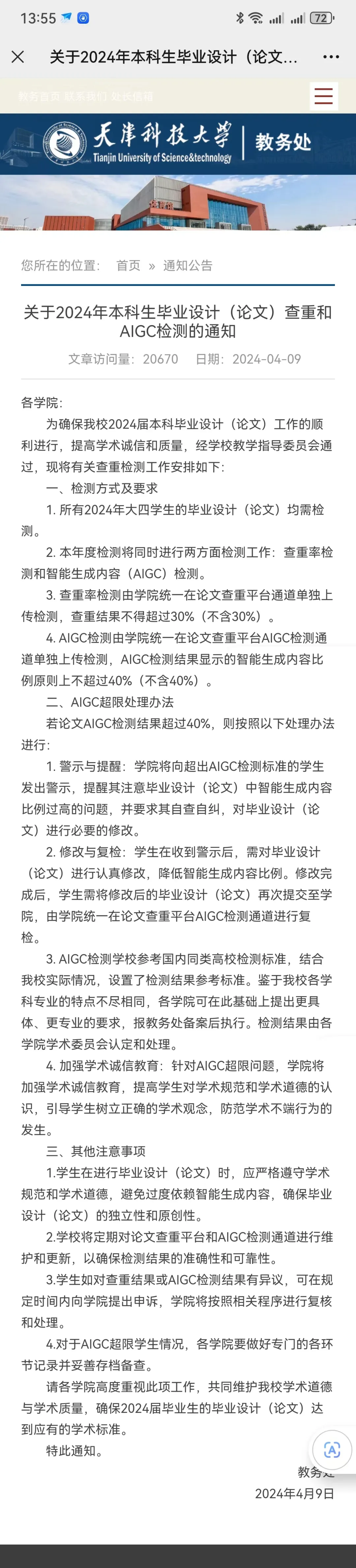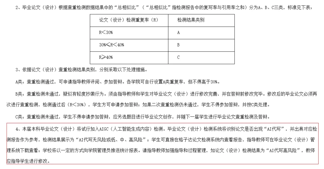 天津科技大学教务处发文规定,若本科生毕业论文中生成式AI检测的结果超过40%,学院将向学生发出警示,并要求其自查自纠;学生在收到警示后,需认真修改,由学院统一在相关平台检测通道进行复检。该校还表示,将加强学术诚信教育,并提醒学生严格遵守学术规范和学术道德,避免过度依赖智能生成内容。