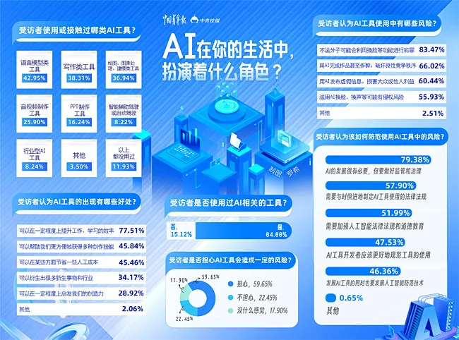 2023年12月,中国青年报社面向全国高校学生发起关于AI工具使用的问卷调查,其中84.8%受访者曾使用过AI工具。