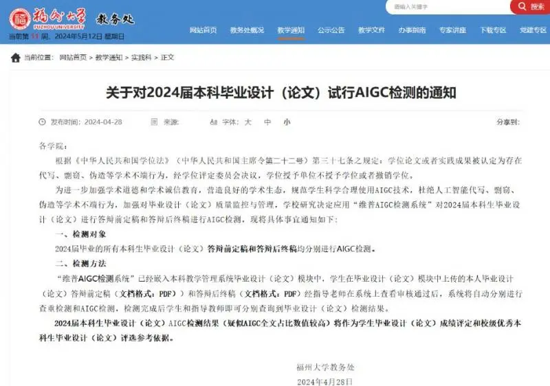 4月28日,福州大学教务处发布通知,决定对2024届本科生毕业设计(论文)进行AI代写的检测,检测结果将作为成绩评定和优秀毕业论文评选的参考依据。