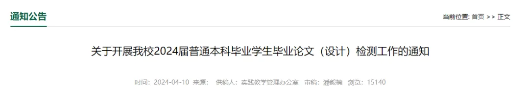 4月10日,湖北大学本科生院发布通知,宣布在本科毕业学生毕业论文审核过程中试行加入对文章使用生成式AI风险情况的检测,如发现该论文检测结果为“AI代写高风险”,教师应指导学生进行修改。