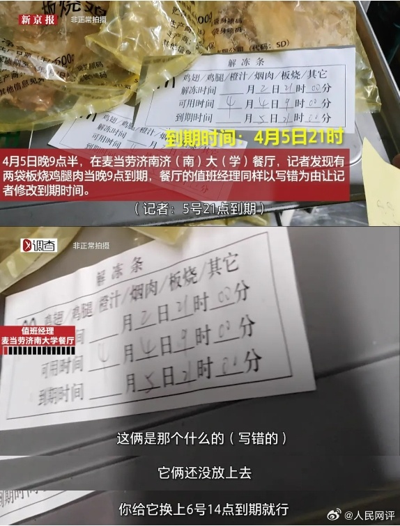 据报道,近期,有记者先后卧底麦当劳郑州卓越农联餐厅和麦当劳济南大学餐厅,发现两家餐厅均存在篡改食品保质期标签、使用过期食材、食物过了保存期依旧售卖以及偷工减料等问题。麦当劳郑州卓越农联餐厅还存在炸油品质超标的情况。