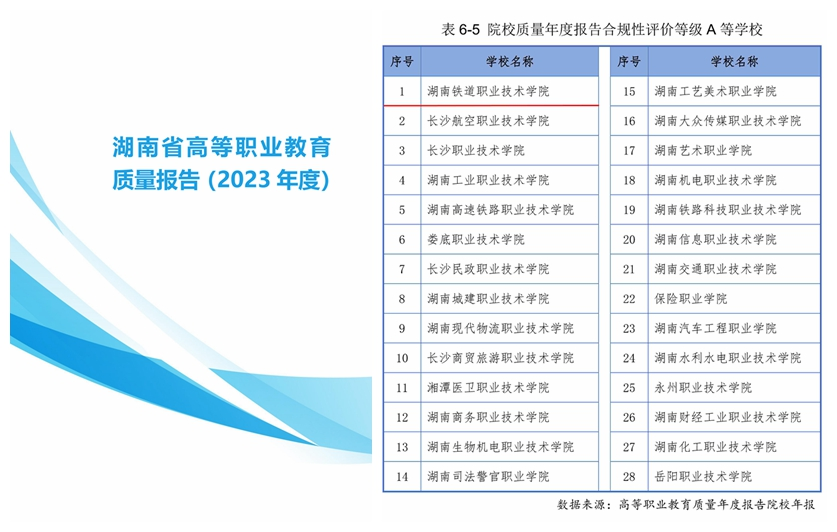 湖南日报·新湖南客户端5月13日讯(通讯员 刘博菱)近日,中国教育科学研究院职业教育质量年报报送平台正式发布《湖南省高等职业教育质量报告(2023年度)》,经省教育厅遴选,湖南铁道职业技术学院编制的《湖南铁道职业技术学院高等职业教育质量报告(2023年度)》在院校质量年度报告合规性评价中获评A等第一名。自2018年以来,该校已连续6年获评院校质量年度报告合规性评价等级A等学校。