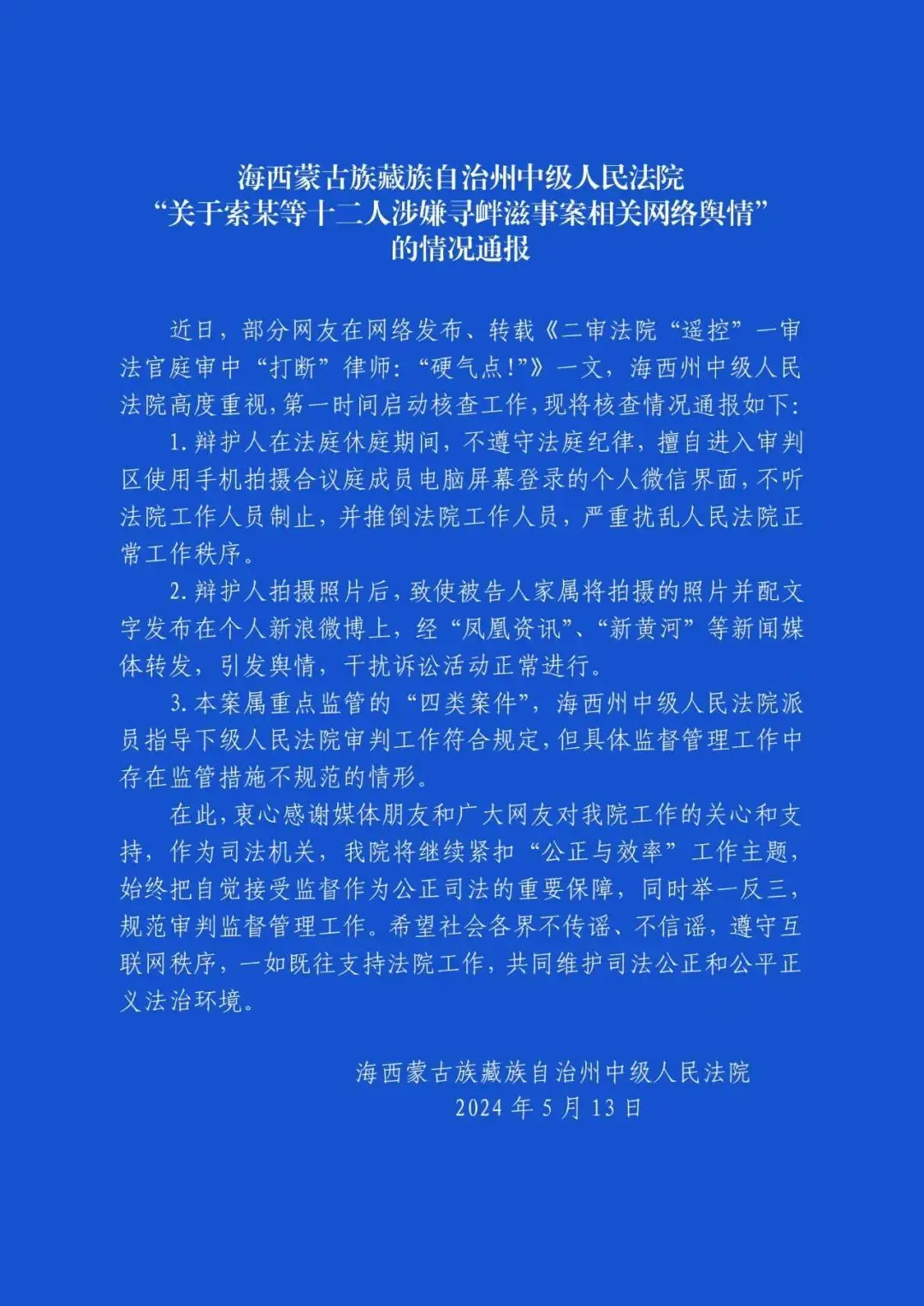 5月13日19时32分,“青海海西州中级人民法院”微信公众号发布“关于索某等十二人涉嫌寻衅滋事案相关网络舆情”的情况通报: