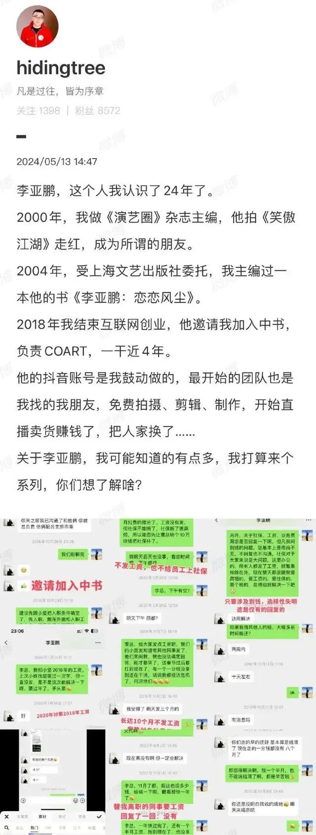 5月13日,有博主晒出与李亚鹏的聊天记录截图,称自己加入李亚鹏公司4年,帮助李亚鹏组建团队、做新媒体账号,但李亚鹏拖欠员工工资,不给员工交社保。博主说多次催促无果,“只要提到钱,他就选择性失明,不回复。”