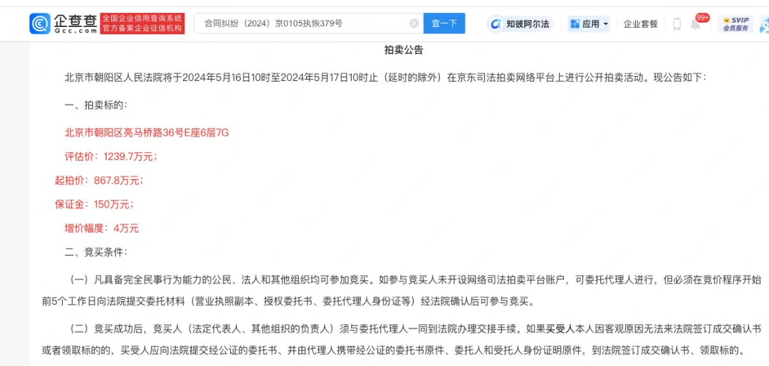 据企查查APP显示,北京泰和友联投资有限公司与李亚鹏、李亚炜等合同纠纷于近日新增司法拍卖公告,拍品名称为北京市朝阳区亮马桥路36号E座6层7G,评估价1239.7万元,起拍价867.8万元,拍卖时间为5月16日至5月17日。