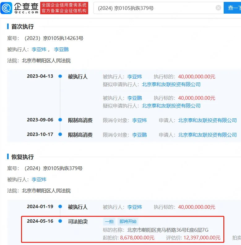 中国执行信息公开网显示,2023年10月17日,因未按时履行生效法律文书确定的给付义务,李亚鹏及哥哥李亚炜被限制高消费,申请人为北京泰和友联投资有限公司(下称泰和友联公司),执行法院为北京市朝阳区人民法院。