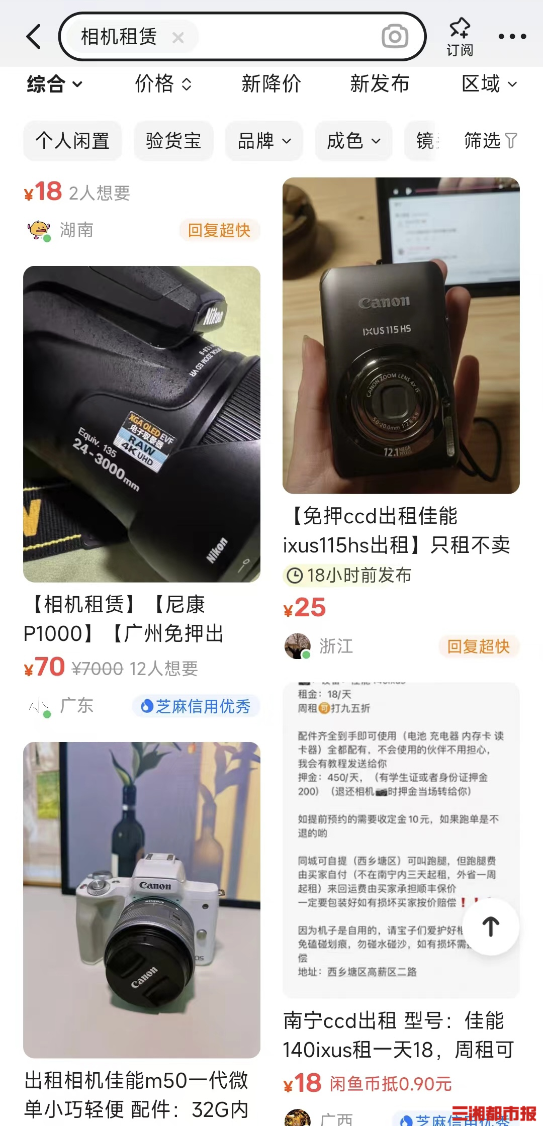 “对于我这种非专业人员,相机使用率不高,买回来也是落灰。所以旅游时,我会选择在闲鱼上租一台相机,这样对我来说更加划算。”24岁的李女士十分享受以租代买的生活方式,她介绍,根据相机型号的不同,价格也会有所差异,一天租金多为50元至200元不等。
