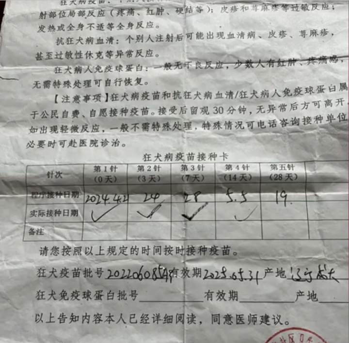 当天,家人就带孩子注射了狂犬病疫苗,但乡下缺少狂犬病免疫球蛋白,又因孩子伤势严重,家人立刻带孩子赶往南阳市,最后找到一个24小时犬伤处理预防接种综合门诊,清洗了伤口并注射狂犬病免疫球蛋白。