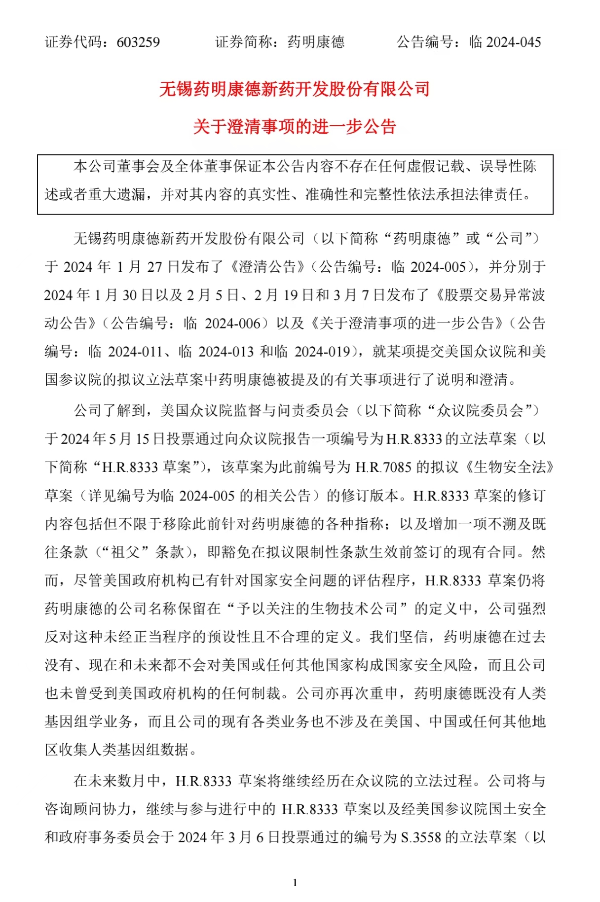 16日,药明康德发布公告回应,强烈反对《生物安全法》草案中对公司不合理的定义。