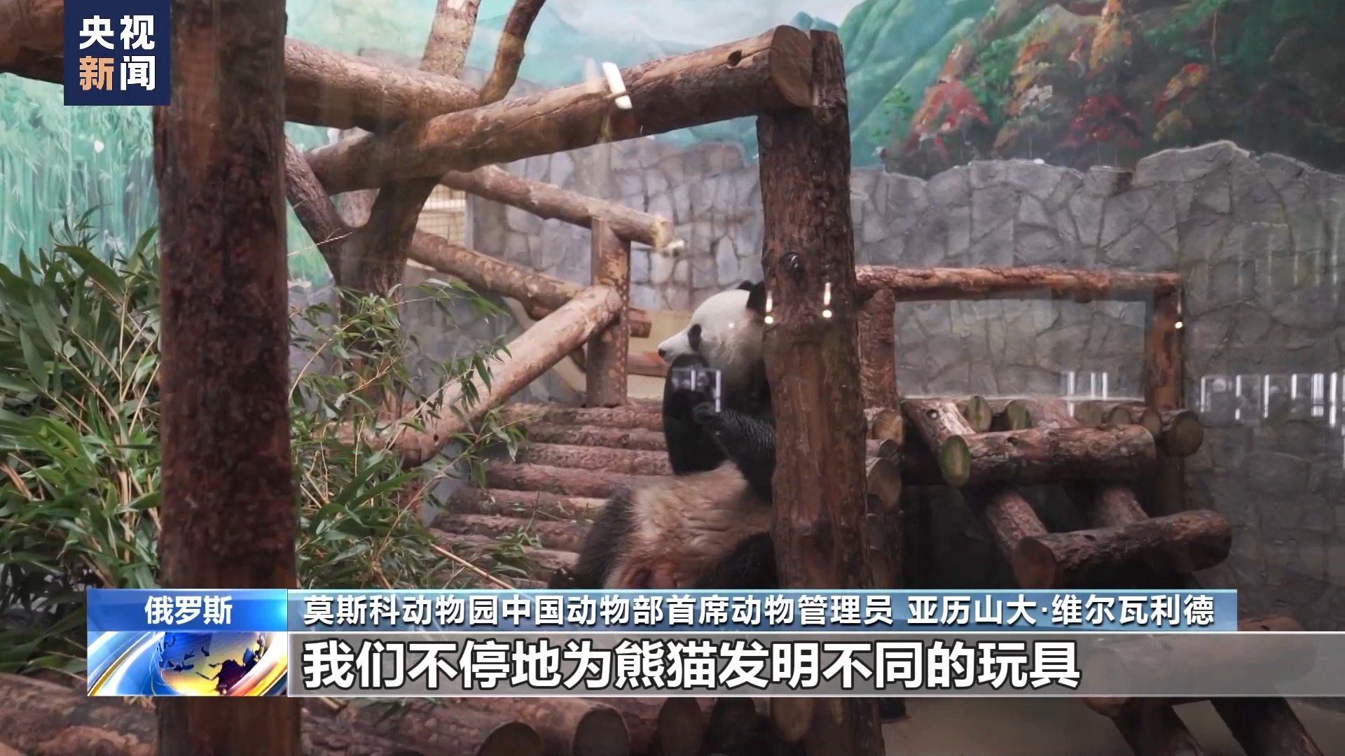 莫斯科动物园中国动物部首席动物管理员 亚历山大·维尔瓦利德:我们不停地为熊猫发明不同的玩具,不管室内还是室外的场地都搭建了很大的攀爬结构。在这里,我们教会了它们伸左爪、伸右爪、躺下、翻滚。