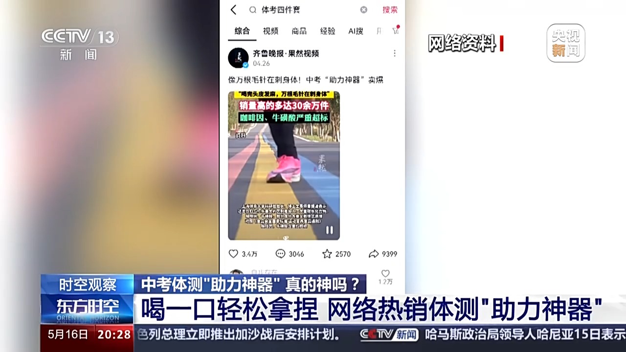近年来,体育教育越来越受到重视,一些地方逐步增加体育中考的分值。近期,各地陆续进入中考体育考试时间。而最近一段时间,多款被称为中考体测“助力神器”的饮料出现在一些网络购物平台上,它们号称“跑步更快”,“冲刺更猛”,“轻松笑傲中考体育”。这些所谓的中考体测“助力神器”究竟是什么?是否能像其宣传的能让学生超常发挥?这种“助力神器”对青少年身体健康有何影响?真的有那么神吗?