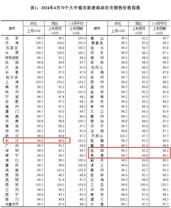 就湖南三城来看,长沙4月新房价格环比下跌0.6%,同比下跌0.4%。长沙二手房价格环比下跌1%,同比下跌5.4%;岳阳4月新房价格环比下跌0.5%,同比下跌4.8%。岳阳二手房价格环比下跌0.7%,同比下跌5%;常德4月新房价格环比下跌0.8%,同比下跌5.2%。常德4月二手房价格环比下跌1.2%,同比下跌6.5%。