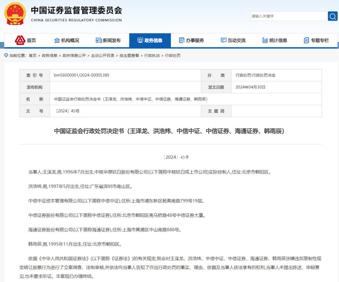 根据中国证监会官网近日公布的行政处罚决定书显示,因违反限制性规定转让中核钛白(002145 SZ)2023年非公开发行股票、信息披露违法等违法违规行为,中核钛白实控人王泽龙及朋友洪浩炜、中核钛白原董秘韩雨辰、中信证券、海通证券及中信中证合计被罚没2.35亿元,其中王泽龙被罚没1.33亿元。