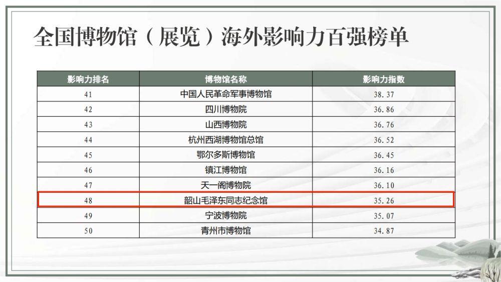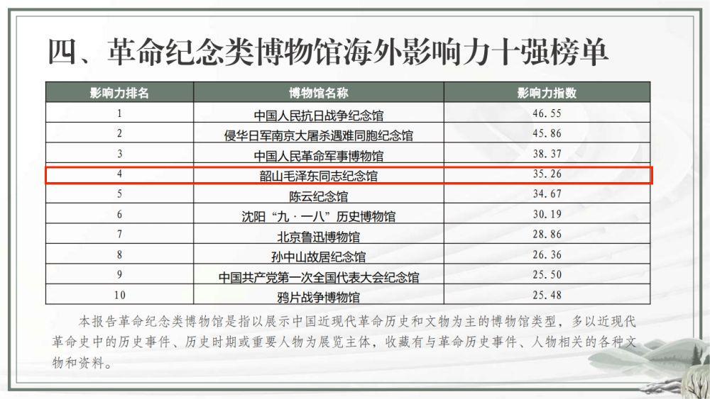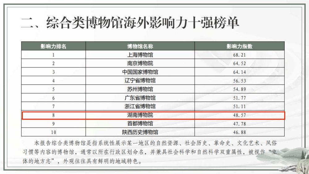 此外,湖南还有湖南博物院入选“综合类博物馆海外影响力十强榜单”,位居第八;韶山毛泽东同志纪念馆入选“革命纪念类博物馆海外影响力十强榜单”,位居第四。
