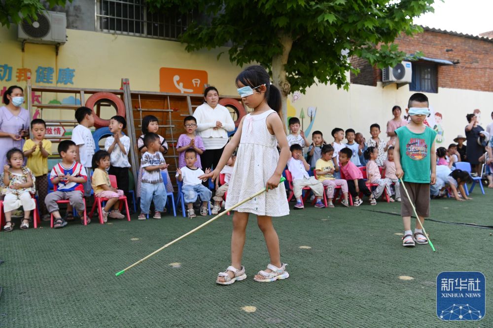 5月17日,在河南省沁阳市第一幼儿园南鲁村分园,两名小朋友带着眼罩体验视障人士出行。新华社发(杨帆摄)