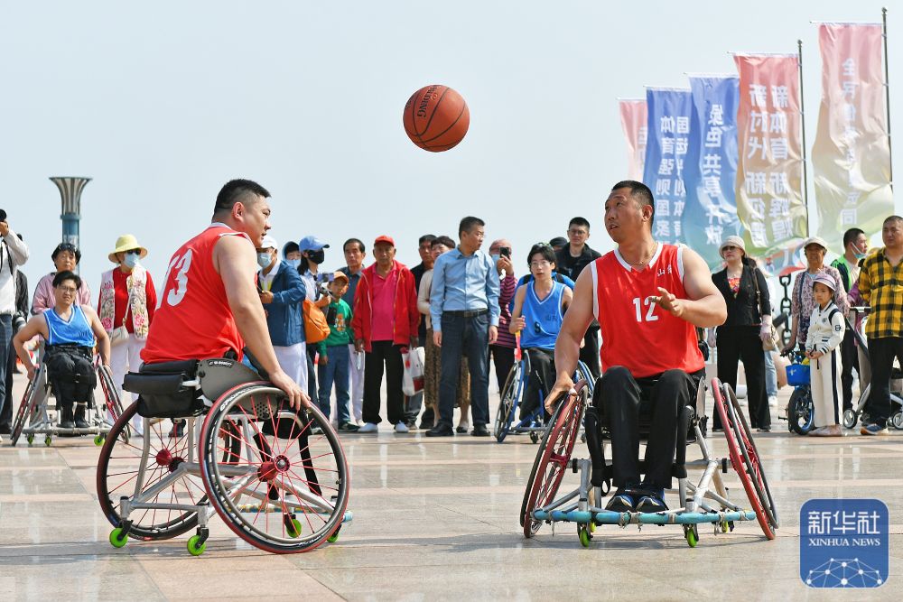 5月18日,在山东省烟台市举办的全国助残日活动现场,残障人士展示轮椅篮球。新华社发(孙文潭摄)