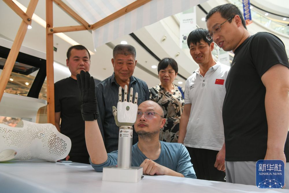 5月18日,浙江省金华市金东区一名残疾人士体验智能仿真手。新华社发(时宽兵摄)