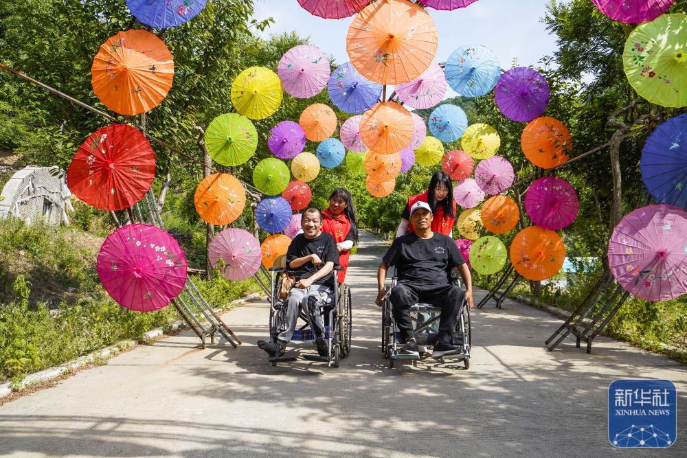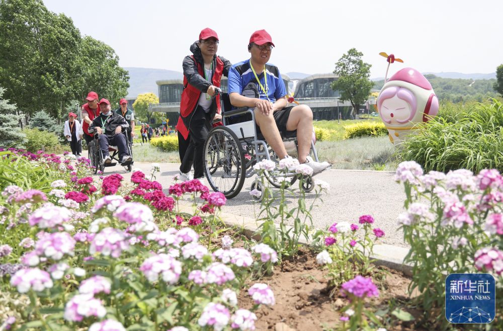 5月18日,河北省遵化市志愿者陪护行动不便的残障人士到景区游览。新华社发(刘满仓摄)