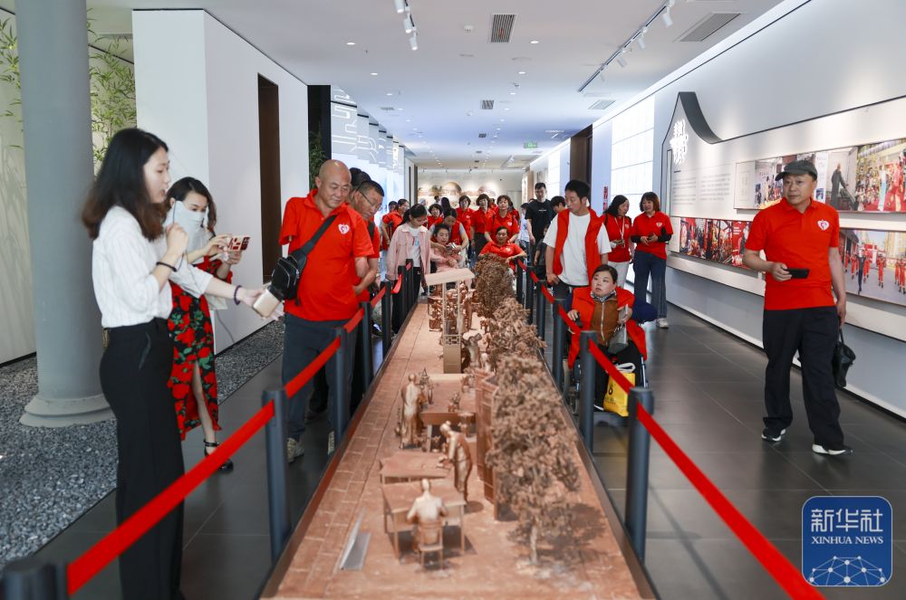 5月18日,公益组织志愿者带领残疾人在江苏省泰兴市博物馆参观非遗木雕。新华社发(顾继红摄)