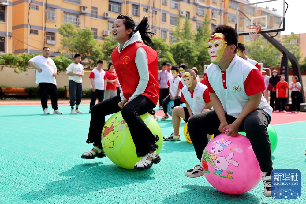 5月17日,在山东省枣庄市市中区特殊教育中心,青年志愿者与智力障碍学生一起做游戏。新华社发(孙中喆摄)