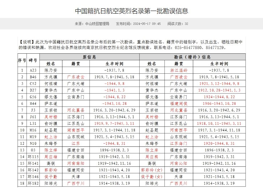 南京抗日航空烈士纪念馆公布第一批抗日航空英烈信息勘误名单。图源:南京日报