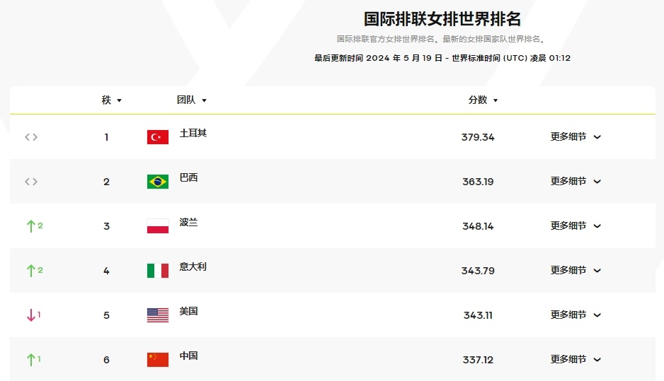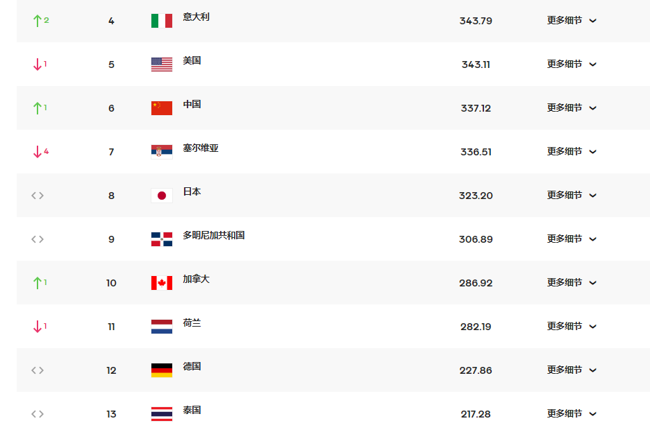 世界排名方面,中国女排以337.12分暂列第六位,主要竞争对手日本女排以323.20分排名第八,泰国女排217.28分排在第13名。