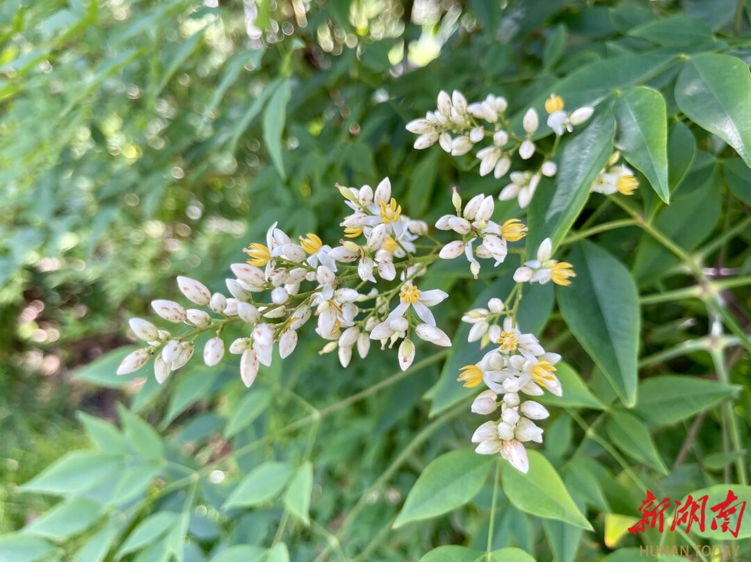 物种物候介绍:郁郁葱葱的灌木丛里,圆锥形的白色花簇好引人注目,走近端详,一簇花序上有好多朵小小的花。有的盛放着,白色花瓣中间六根鹅黄色的雄蕊精致地围成小圆圈,轻轻闻一闻,淡淡的花香;有的还打着花苞,从基部生出一抹微红,摸上去硬硬的。此“竹”似竹但不是“竹”,结构更复杂,小枝对生着,复叶也是对生,小叶片多呈披针形。