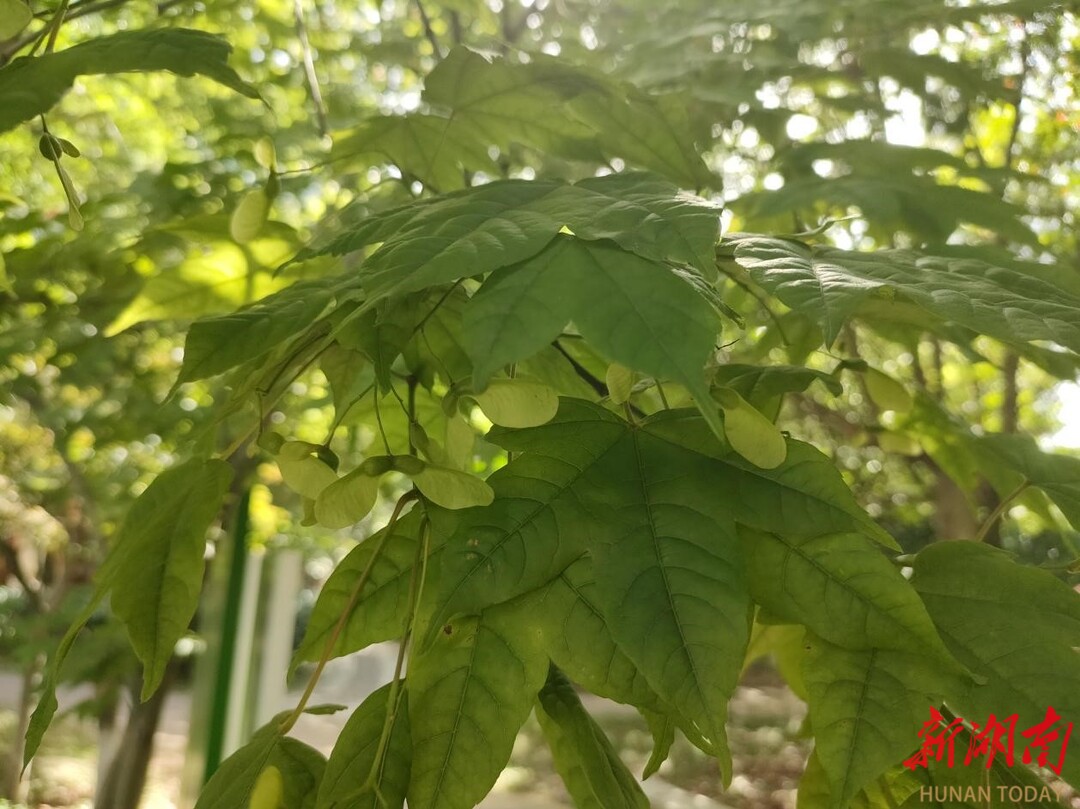 物种物候介绍:在沿路一排鸡爪槭中间,发现有一棵不太一样——叶片都是绿色,翅果也是绿色,是鸡爪槭的果,翅膀尖有一小块显眼的红色。它的叶裂不如鸡爪槭深,倒是和枫香很像,每个“小手指”显得圆润,叶端急尖像拖了个小尾巴。两片翅果张开的角度比鸡爪槭小,翅不似鸡爪槭细长,比较短而圆。叶柄摸上去有很薄的细软的茸毛。按特征查询,这是毛脉槭。