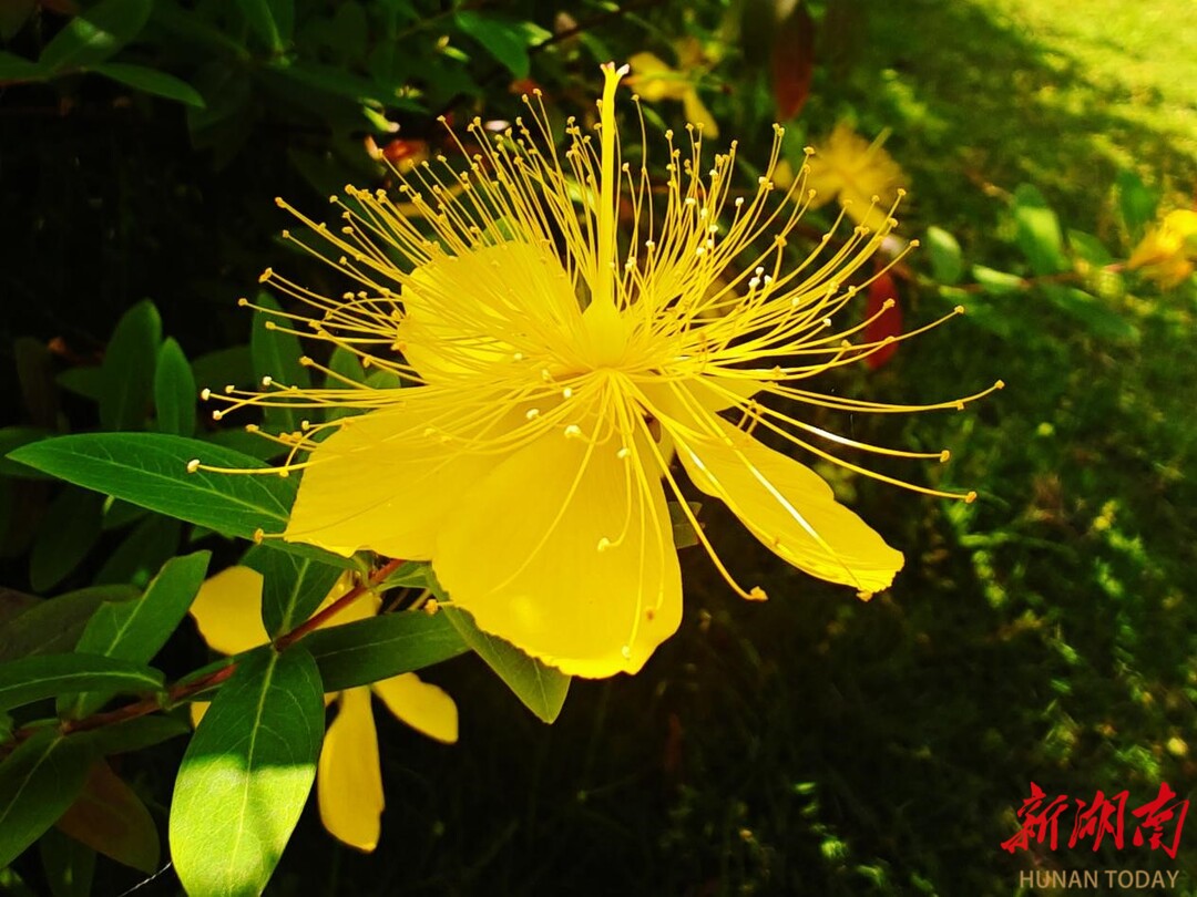 物种物候介绍:每年小满节气前后,都是金丝桃盛放的时节。迎着初夏的艳阳,那丝丝花蕊像透着金光一般熠熠生辉。《群芳谱》描述它“铺散花外,若金丝然”,因为它的雄蕊特别长,甚至比花瓣还长,所以从侧面看它,就像金丝一般舒展开来,而未开花时的花苞又类似桃子的形状,也许这就是它名字的来由吧!