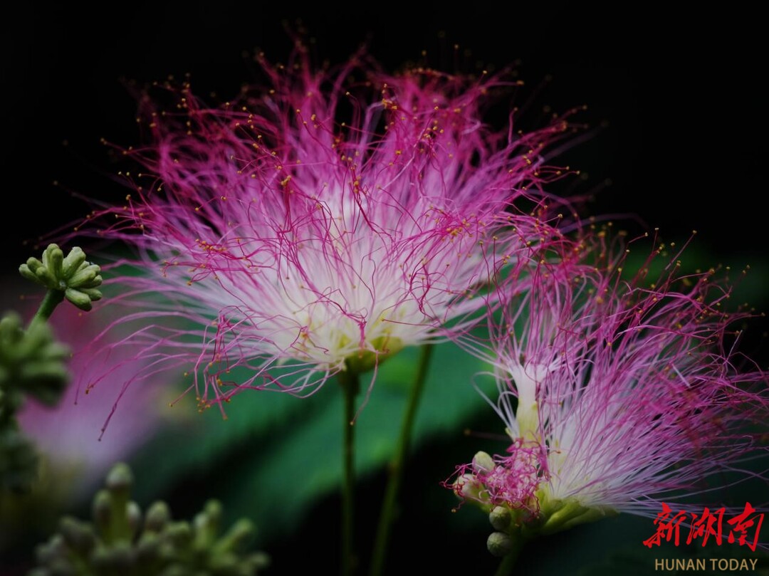 物种物候介绍:小满如期而至,合欢如约而开。如小扇子一样的花型在风中摇曳,煞是好看。这不是一朵花,而是由很多朵小花组成的一个头状花序,每朵小花吐出几个花丝,聚合在一起,就成了这个模样。“妾戴忘忧草,郎配合欢花”,合欢跟忘忧草(即萱草)一样,在古时都有解郁安神的药用价值。《神农本草经》记载了合欢可以“安五脏,和心志,令人欢乐无忧”。