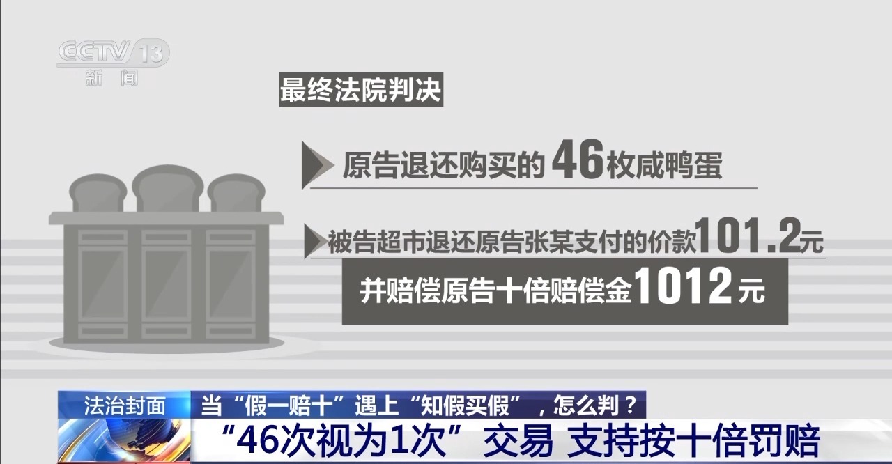 法院认为,张某购买46枚咸鸭蛋,共支付价款101.2元,从总量的角度看,其购买行为未超出个人和家庭等的合理生活消费需要。人民法院从保护正常消费的角度出发,以张某实际支付的总价款101.2元为基数,计算价款十倍惩罚性赔偿金1012 元。最终法院判决,原告退还购买的46枚咸鸭蛋,被告超市退还原告张某支付的价款101.2元,并赔偿原告十倍赔偿金1012元。