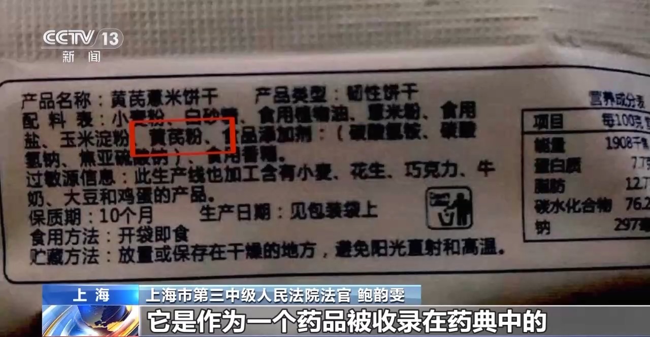 上海市第三中级人民法院法官鲍韵雯:原告诉请的主要依据在于饼干作为普通食品,其中不应当添加有药品,那么黄芪粉是作为一个药品被收录在药典中的,所以被告未经有关机关的审批,就在饼干中添加药品,是违反了我国食品安全法相关规定的。