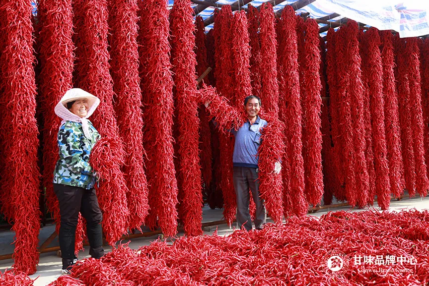 甘谷县地处甘肃省东南部,渭河上游。北部的黄土高原,南部的秦岭山脉,构成了甘谷多样的地形地貌,也为这片土地上农产品的生长提供了得天独厚的地理条件。而这里种植辣椒的历史悠久,可以追溯到400多年前,明朝叶应甲所编《伏羌县志》中就有对甘谷辣椒的记载,它曾作为明末清初的宫廷贡品而享誉陇上。甘谷是我国辣椒栽培的最早县份之一,因此有“辣椒之乡”的美誉。尤其是该县的磐安镇,到了秋天,几乎家家户户的庄前屋后、檐下树上都会挂满红彤彤的辣椒串儿,处处椒香迷人。