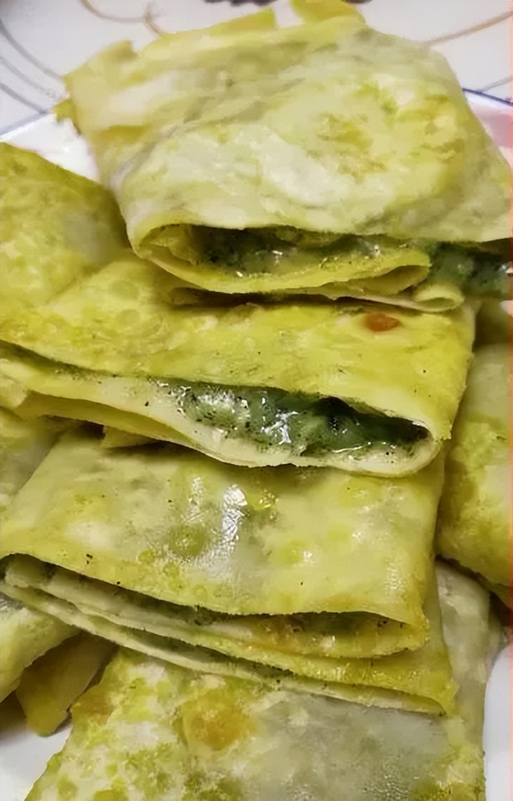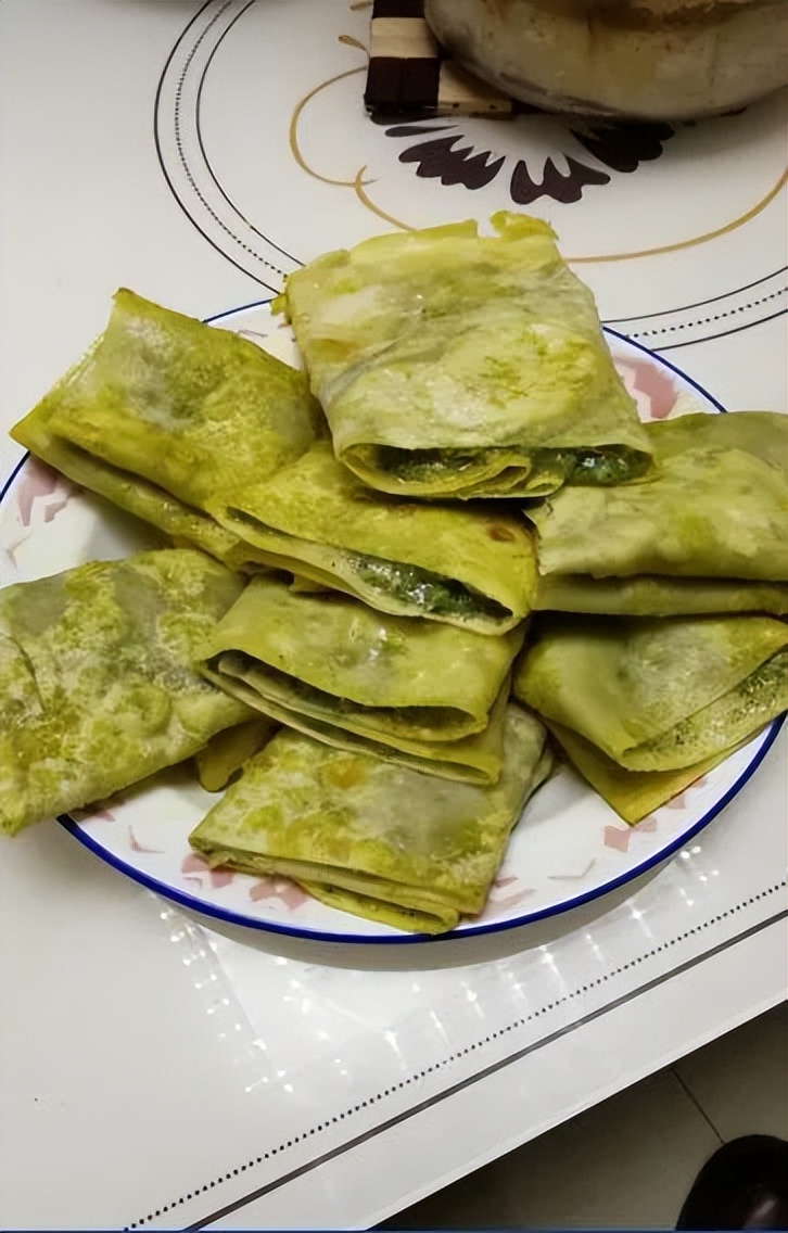 先将小麦面半发酵,用菜籽油的烙成油饼“列阵”;再做萱麻豆面拌汤,将萱麻绿叶冲洗净切碎,放入小锅开水中焯一分钟,萱麻就自然投降缴械了扎人的毛刺,释放出扑鼻的清香味,小锅开水也化作碧绿的汤;这时在小锅中撒入青豆面,用筷子顺时针搅拌,做成稠稀均匀不粘碗的拌面汤“待命”;然后掌勺取一点菜籽油烧滚,用黄葱花炝萱麻豆面拌汤,如大战冲锋号角吹响!