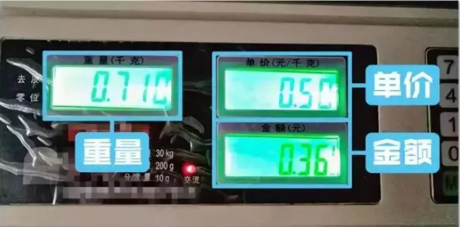 一“看”,看电子秤是否有CMC制造许可证标志、是否张贴有效期内的强检合格绿色标签、商家输入的单价是否正确。
