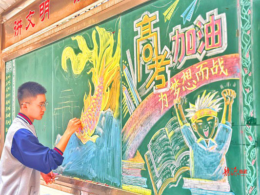 当天,该校政务处组织一批书画特长生志愿者,连日策划构思,以笔传情、用画达意,并赶在这个特殊的日子里,用实际行动“表白”高三的学长学姐们,以新鲜出炉的高考特刊为高三学子亮剑高考摇旗助威,盼“出征”少年凯旋举目守望,为校园留下独属于青春的小美满。