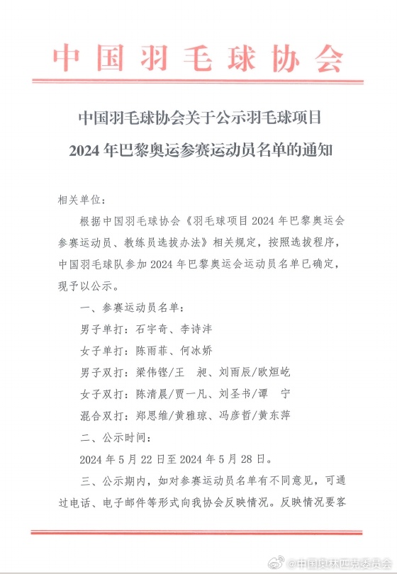 中国羽毛球协会公示巴黎奥运会参赛运动员名单