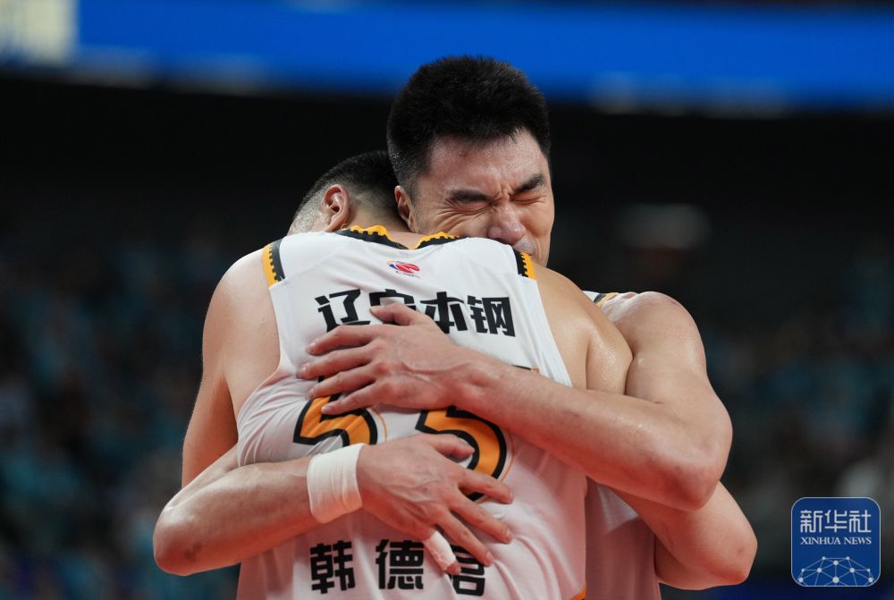 ↑辽宁本钢队球员韩德君(前)与队友李晓旭拥抱庆祝夺冠。新华社记者 孟永民 摄