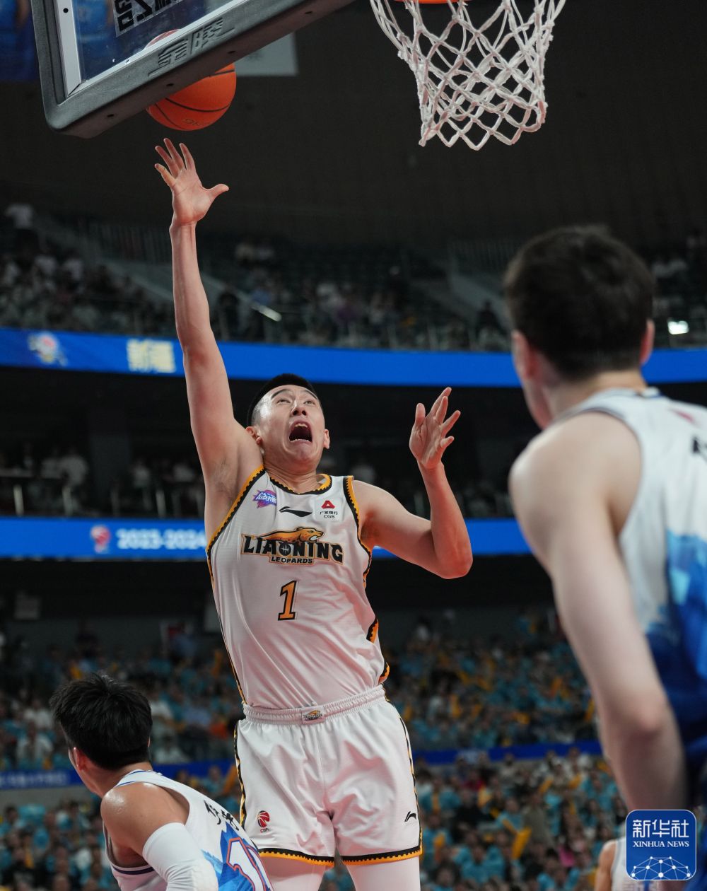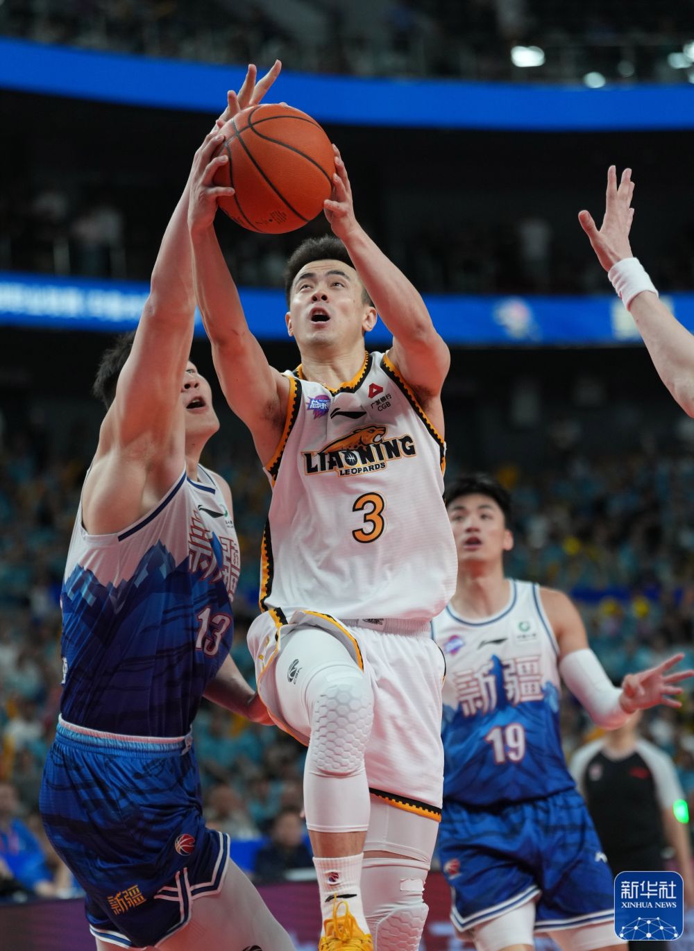 ↑辽宁本钢队球员付豪(中)在比赛中上篮。新华社记者 孟永民 摄