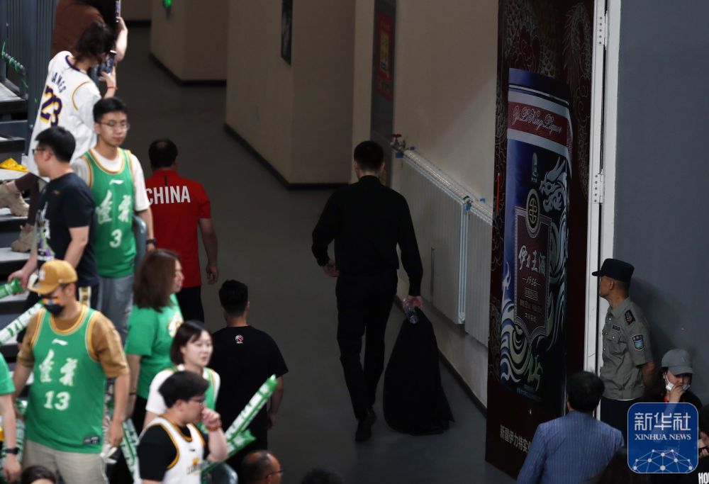 ↑辽宁本钢队球员郭艾伦(左一)在比赛后与新疆伊力特队球员阿不都沙拉木(左二)致意。新华社记者 孟永民 摄