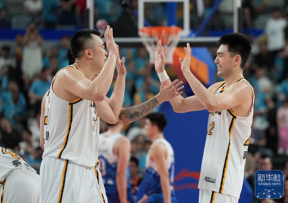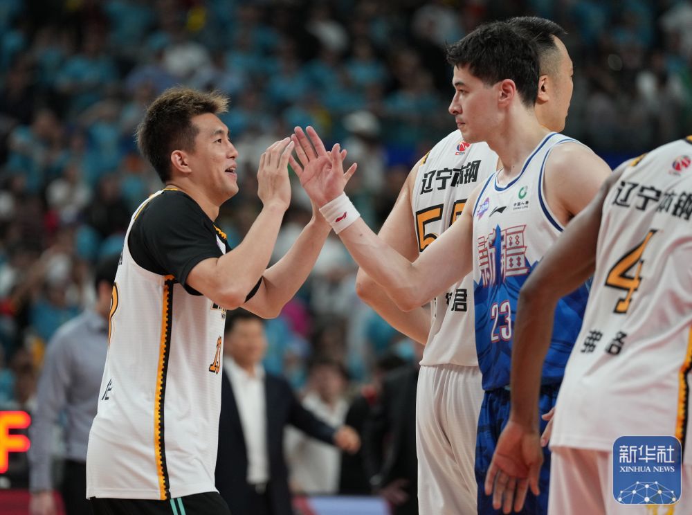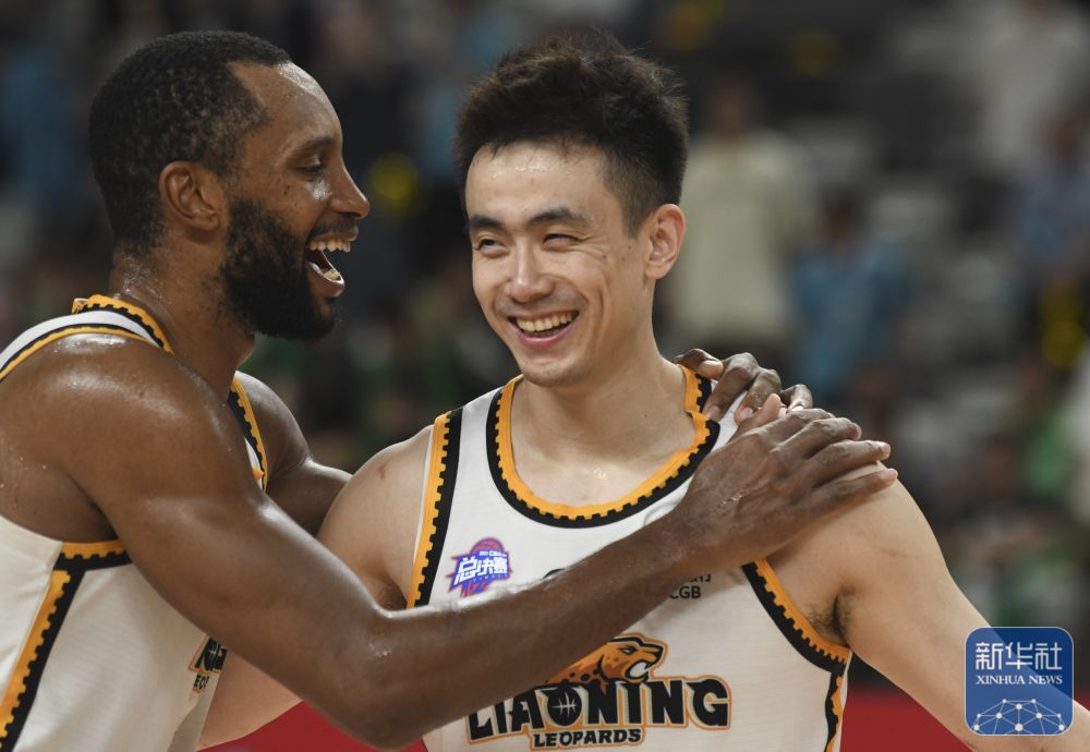 ↑辽宁本钢队球员李晓旭(右)和队友韩德君在比赛最后时刻庆祝。新华社记者 孟永民 摄