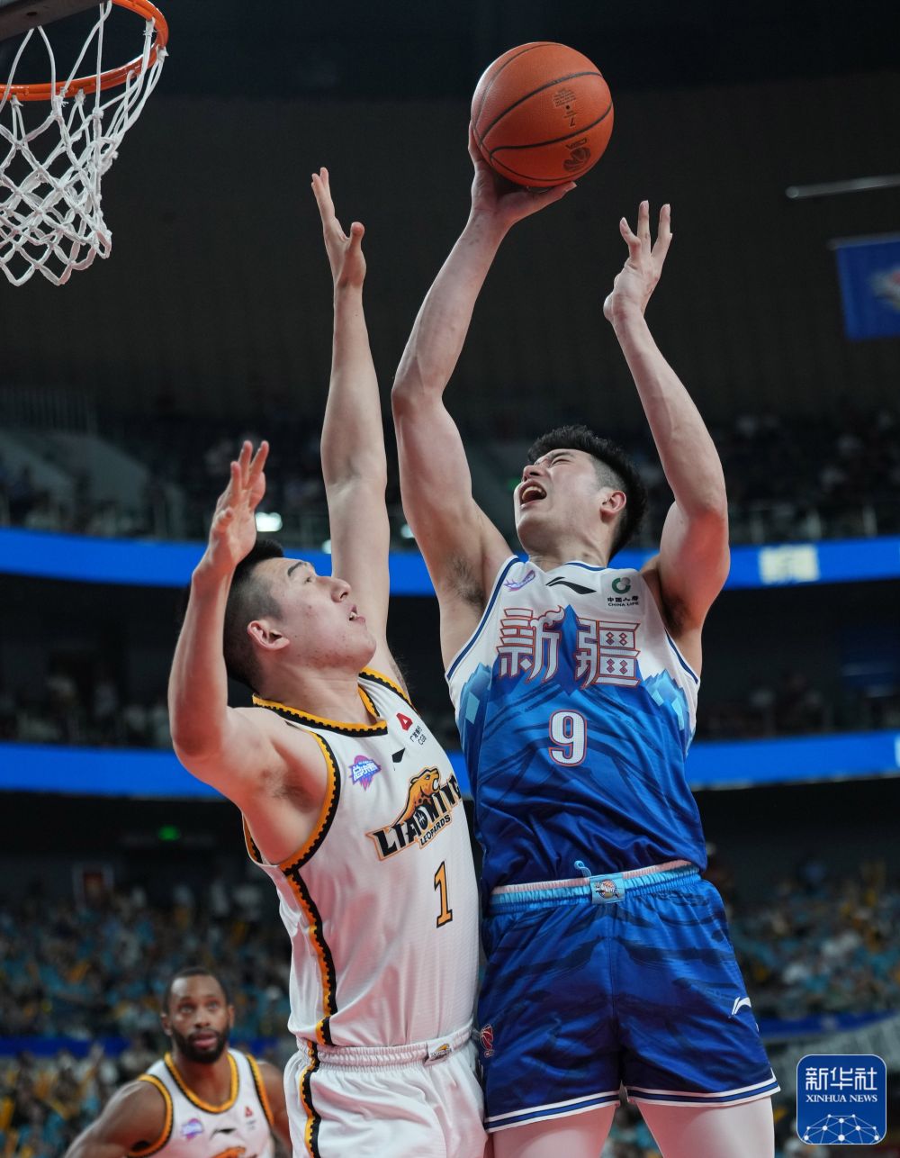 ↑新疆伊力特队球员吴冠希(右)在比赛中投篮。新华社记者 孟永民 摄